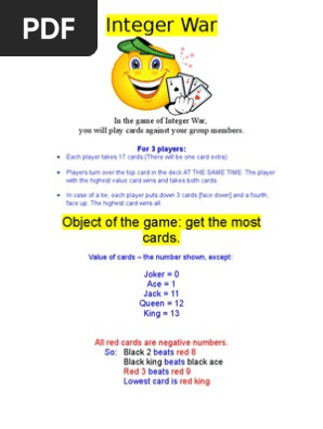 Many teachers use the game integer war with a deck of cards to reinforce integer operations. Integer War Card Game Online This activity includes some elements of suspense speed and even prizes. 52 normal 2 joker cards in a virtual deck of cards or up to 4 decks of car.
